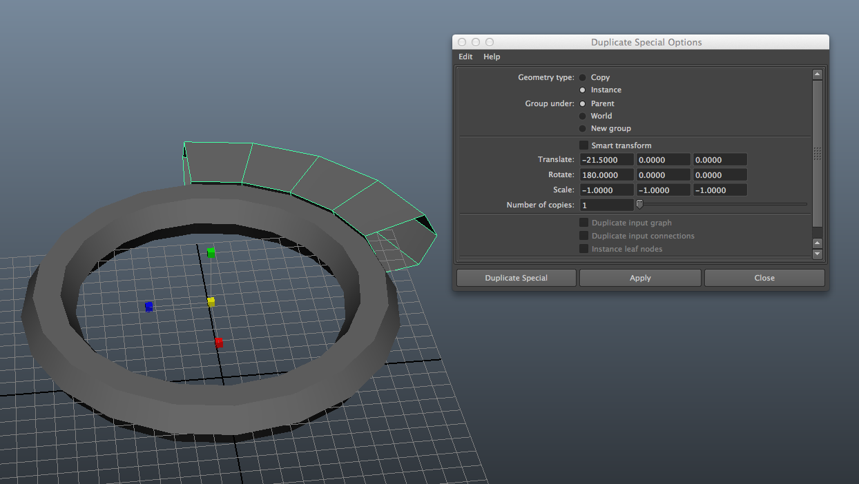 Below, I have used duplicate special on the sword guard and then moved it using the move tool. I also just tested whether the limit information carried over to the duplicate and it has, which is something to keep in mind for future reference.